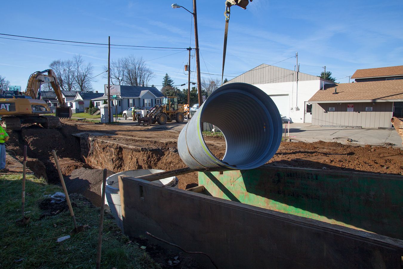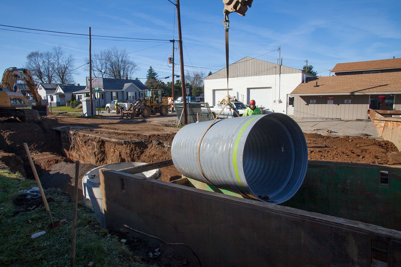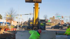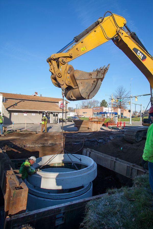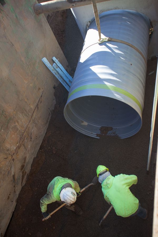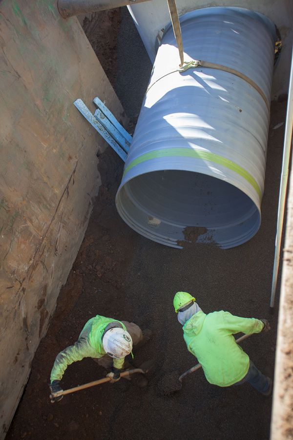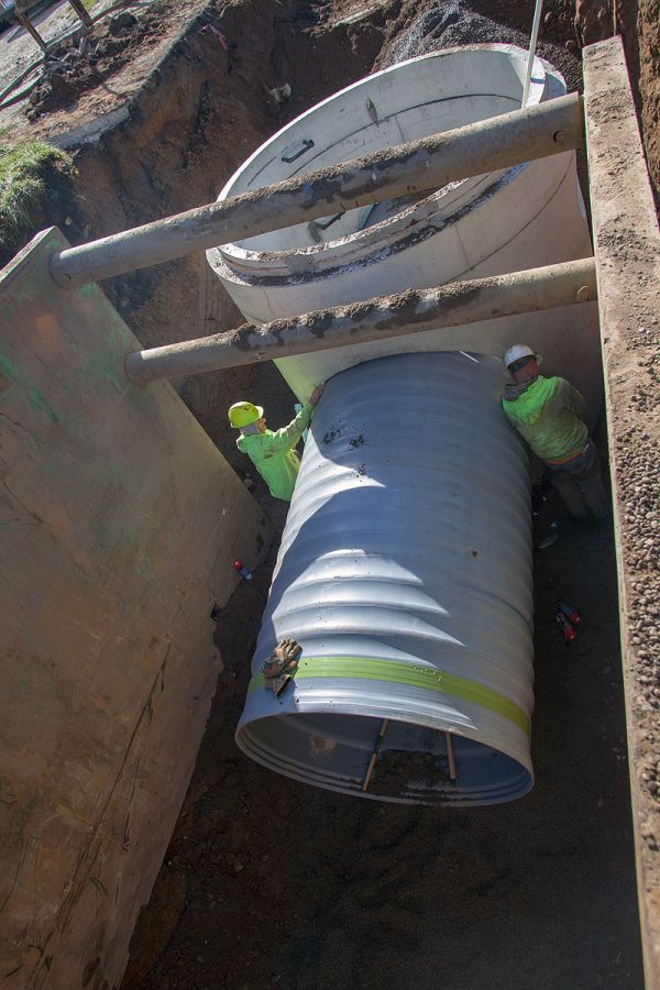 The project involved the installation of 2600 lineal feet of 60" triple wall storm sewer with associated utility replacements, manhole structures and a 72" boring under the existing railroad. Installation depths ranged from 11 to 14 feet in extremely challenging soil conditions.